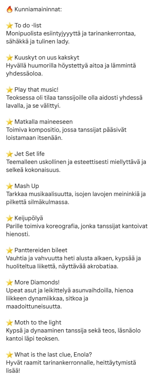 vahva kokonaisuus, jossa hyvä energia. Teos korosti yksilöiden taitoja